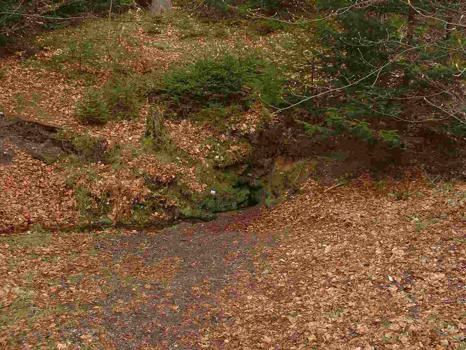 Spiegelteich mit Spiegelbild der Kirche des Christenbergs. Hinter dem mit Efeu bewachsenen Hügel (mit Gedenkstein) ist die Quelle | Nahaufnahmen der