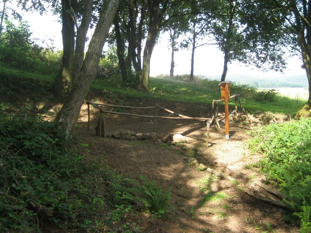 Wenn Sie die Grillhütte auf der Kuppe schon links sehen, sollten Sie das Auto abstellen. Geradeaus geht ein Graspfad oder Grasweg weiter. Nach etwa 150 Metern leicht bergab am rechten Waldrand finden Sie die Forsthausquelle.