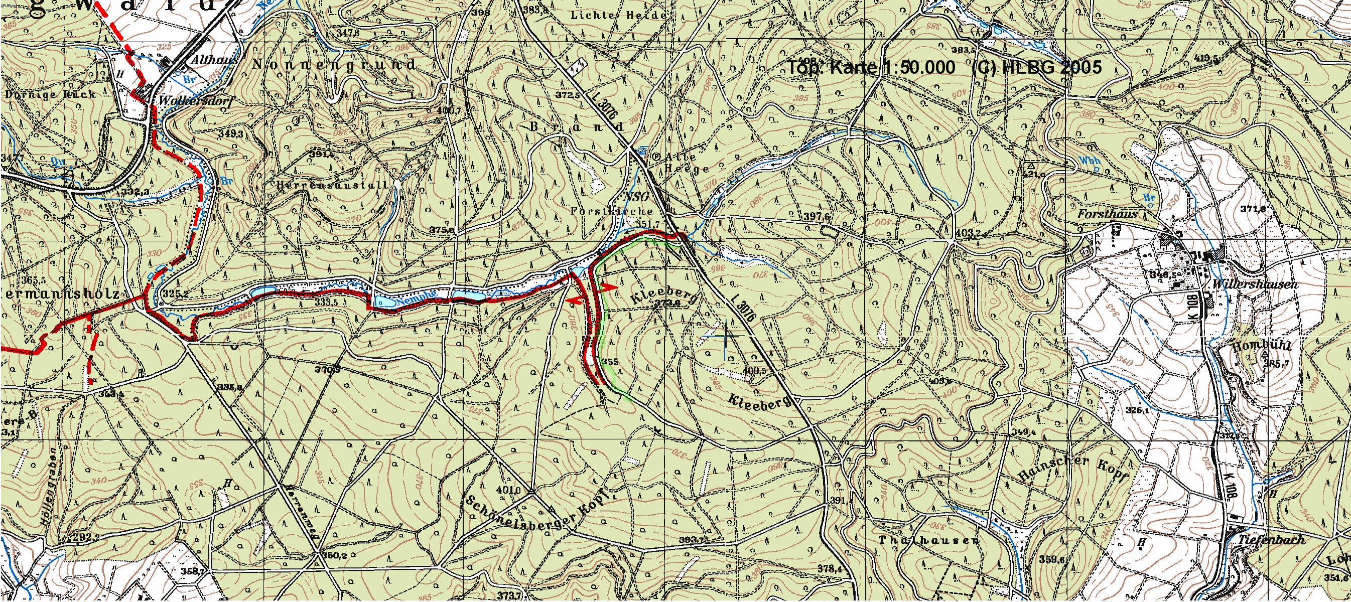 Wenn Sie mit dem Auto von Frankenberg nach Rosenthal fahren, kommen Sie fast am Ende einer leicht abschüssigen langen Geraden an dem Wanderparkplatz Fortskirche vorbei. Etwa 300 Meter weiter kreuzen Sie die Nemphe. Direkt hinter dem Talgrund, wo die Hauptstraße jetzt wieder bergauf führt, biegt nach rechts ein befestigter Weg ab. Diesen nehmen Sie bitte.