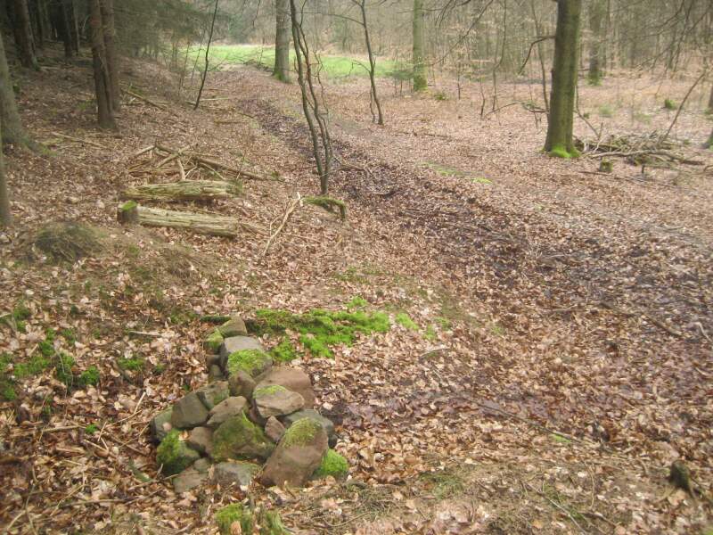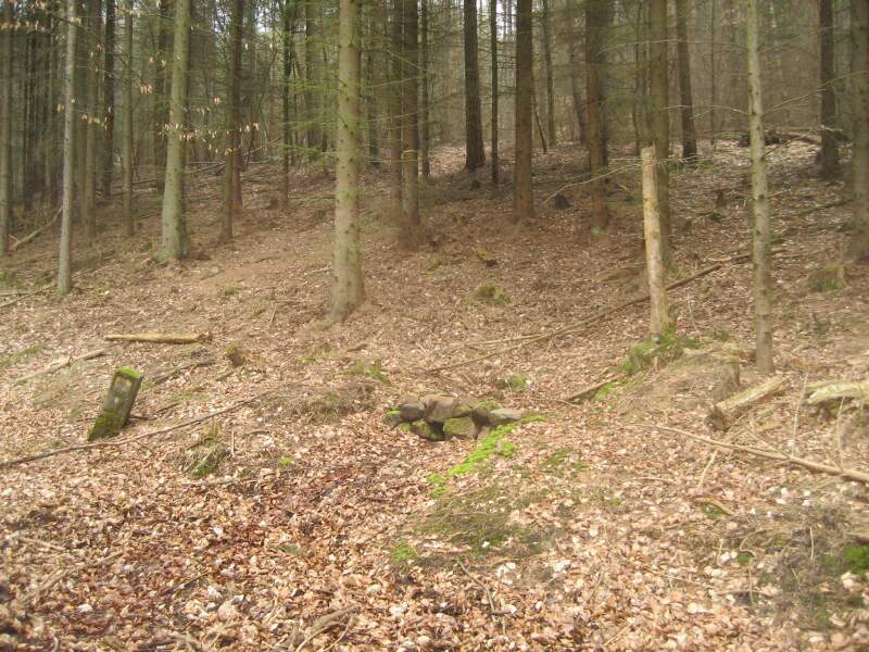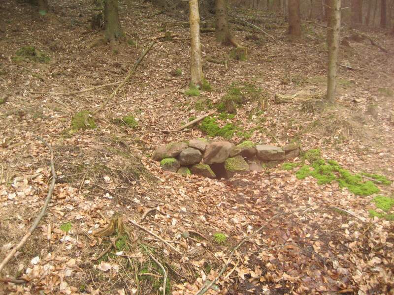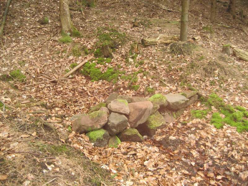 Die Quelle ist eher unscheinbar, ... | aber Wasser sieht man abfließen. | Hinter den Steinen ist der Quellbereich.... | mit einer Größe von ca. 50 cm auf einen Meter. |