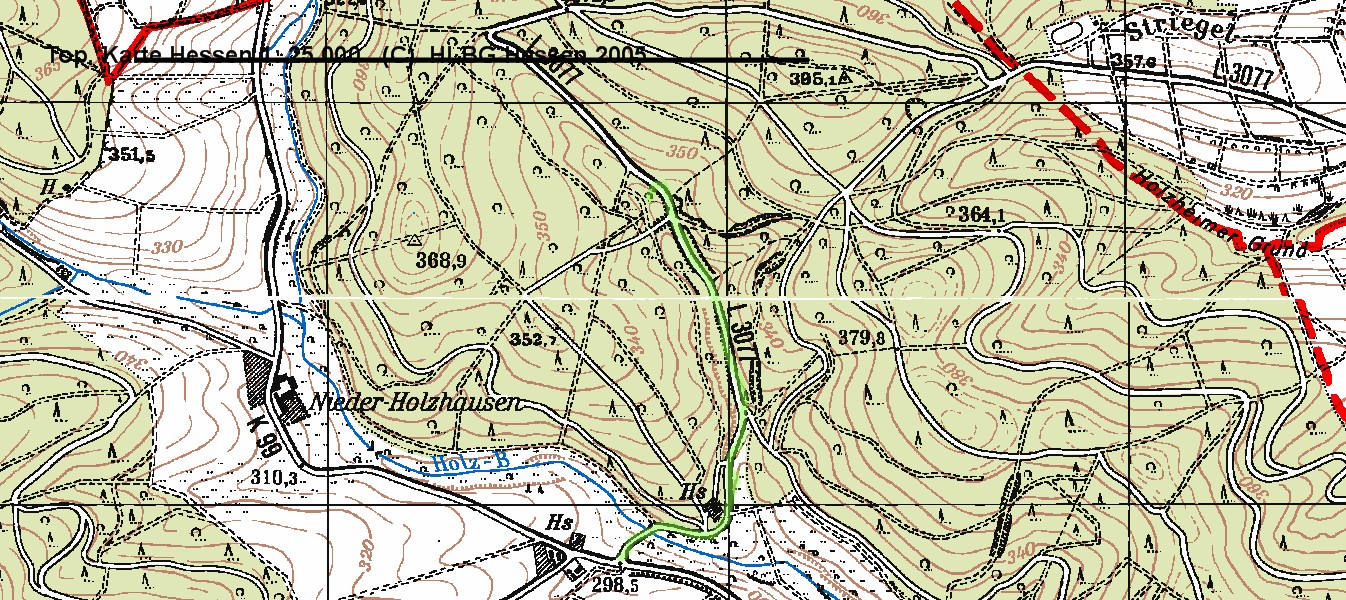 Der Bach fließt in die Holzbach* ab, die ihrerseits in Gemünden in die die Schweinfe und 100 Meter weiter in die Wohra mündet.