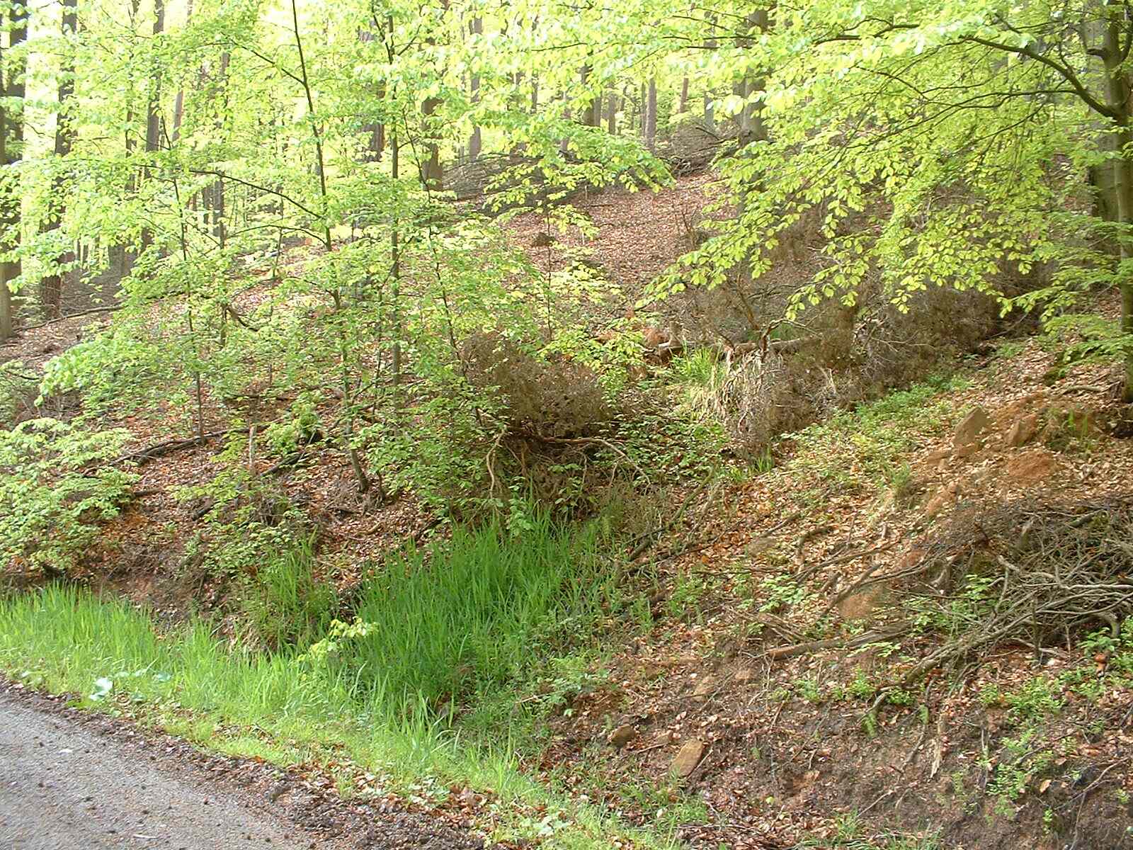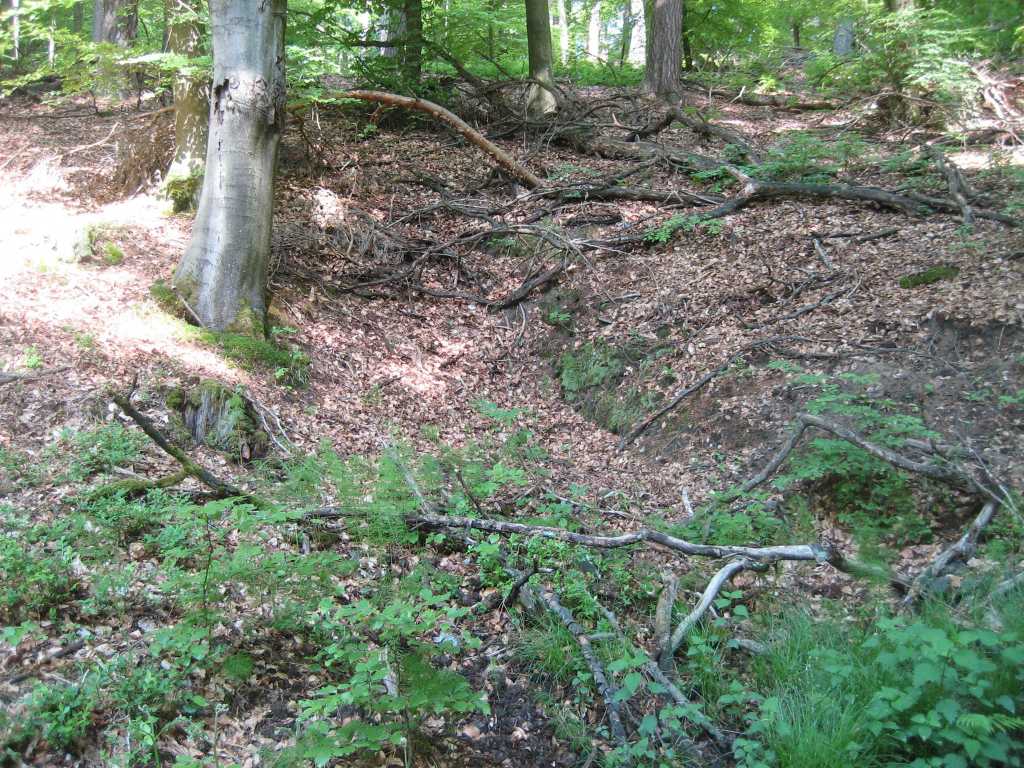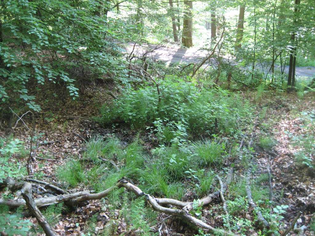 Die zweite Quelle erreichen Sie, wenn Sie etwa 200 Meter weiter gehen bis an einen Waldweg, der nach rechts abzweigt. Gehen Sie diesen Waldweg etwa weitere 300 Meter. Sie sehen dann rechts unten im Tal einen kleinen See, einige Schritte weiter sehen Sie auf der gegenüberliegenden Hangseite die Quelle mit ihrem Abflussgraben.
