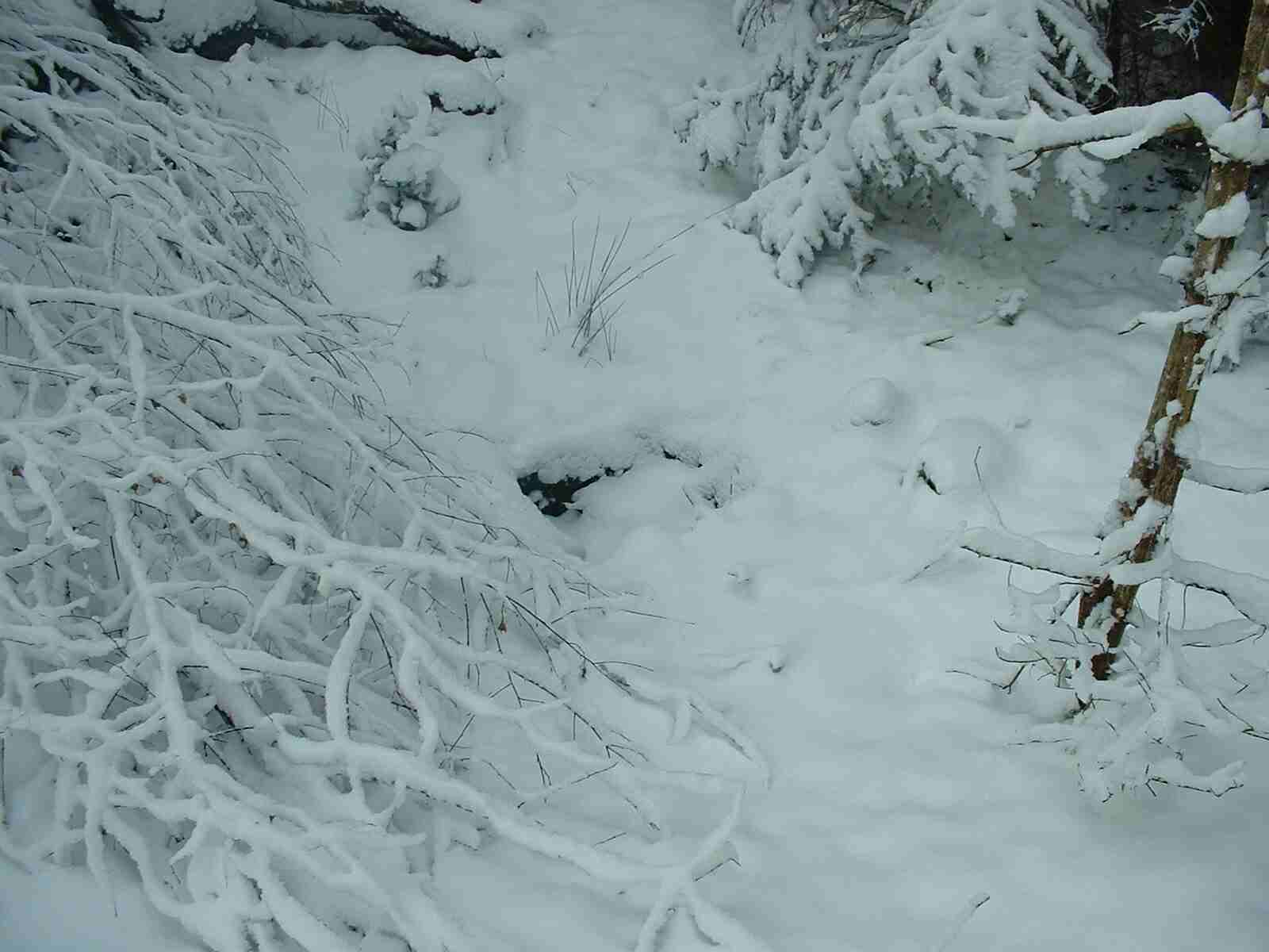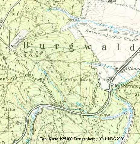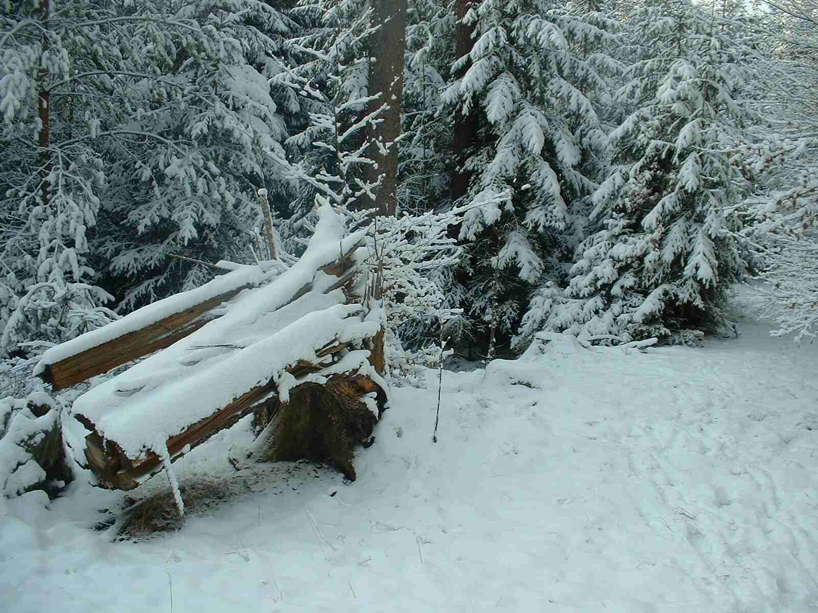 Wenn Sie sich direkt wieder zur B 252 hinwenden, sehen Sie, dass geradeaus ein Pfad in den Wald führt. Diesem folgen Sie ca. 100 Meter. Am Ende der Geraden sehen Sie links einen Stumpf von einem abgebrochenen Baum. Ein paar Meter darunter ist die unscheinbare Quelle.