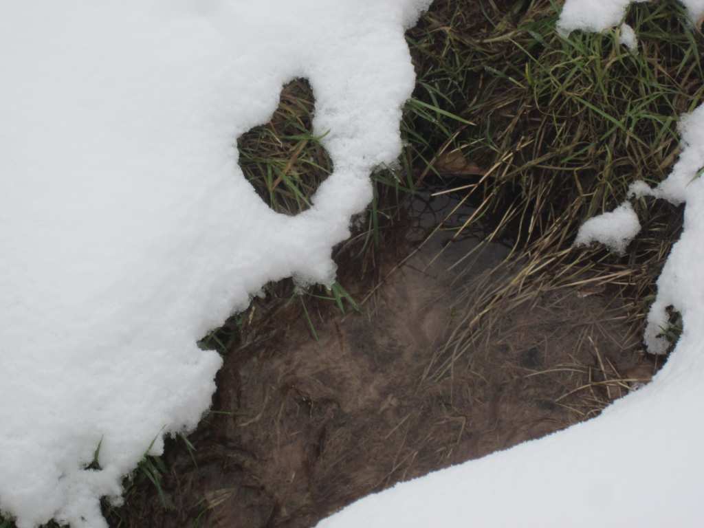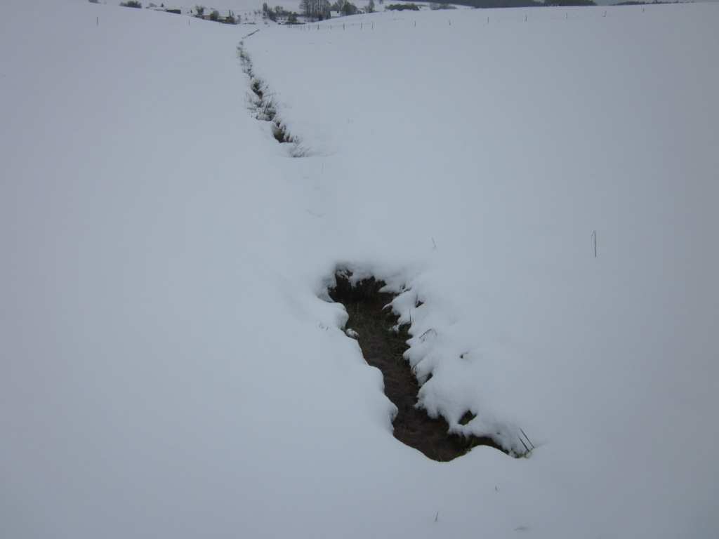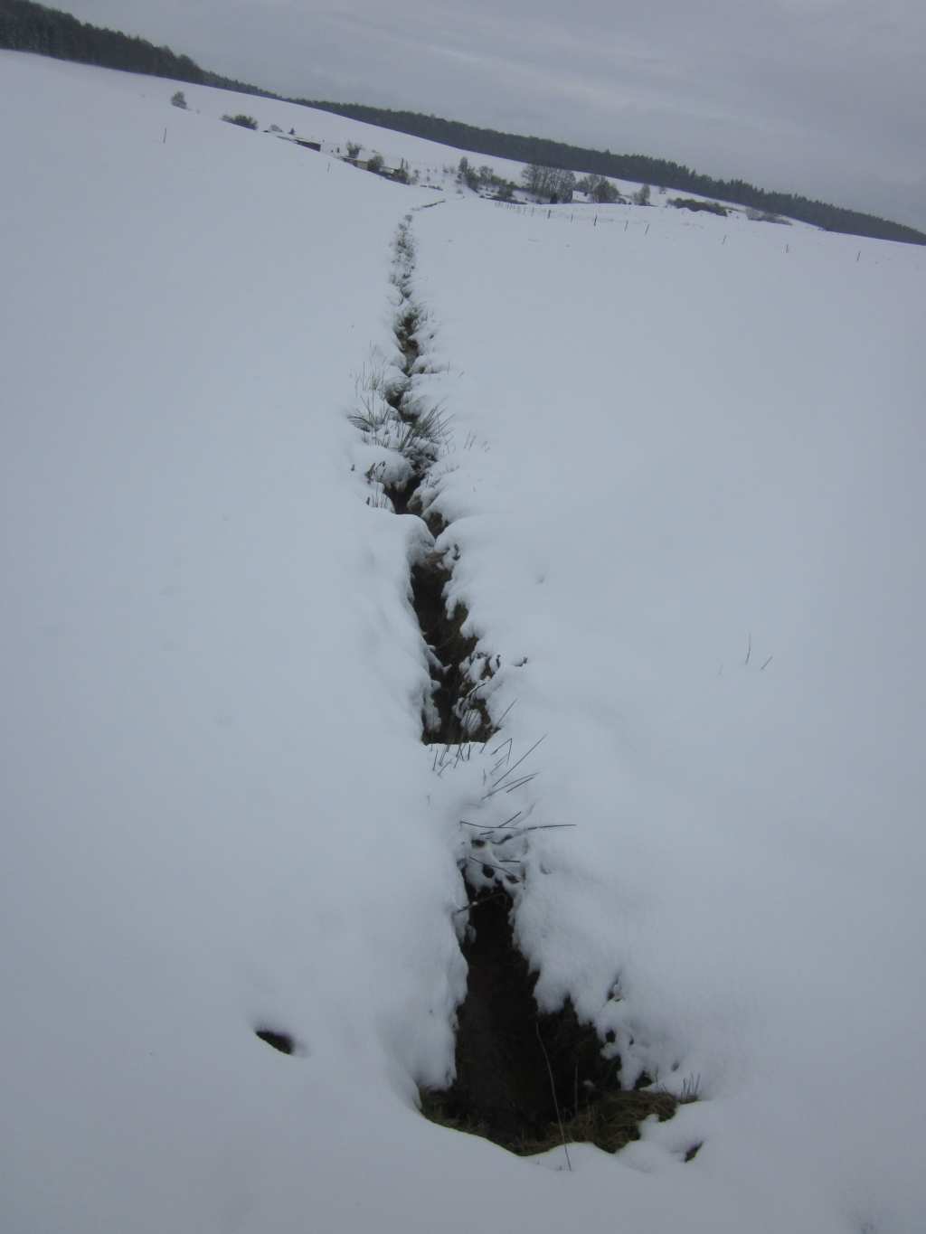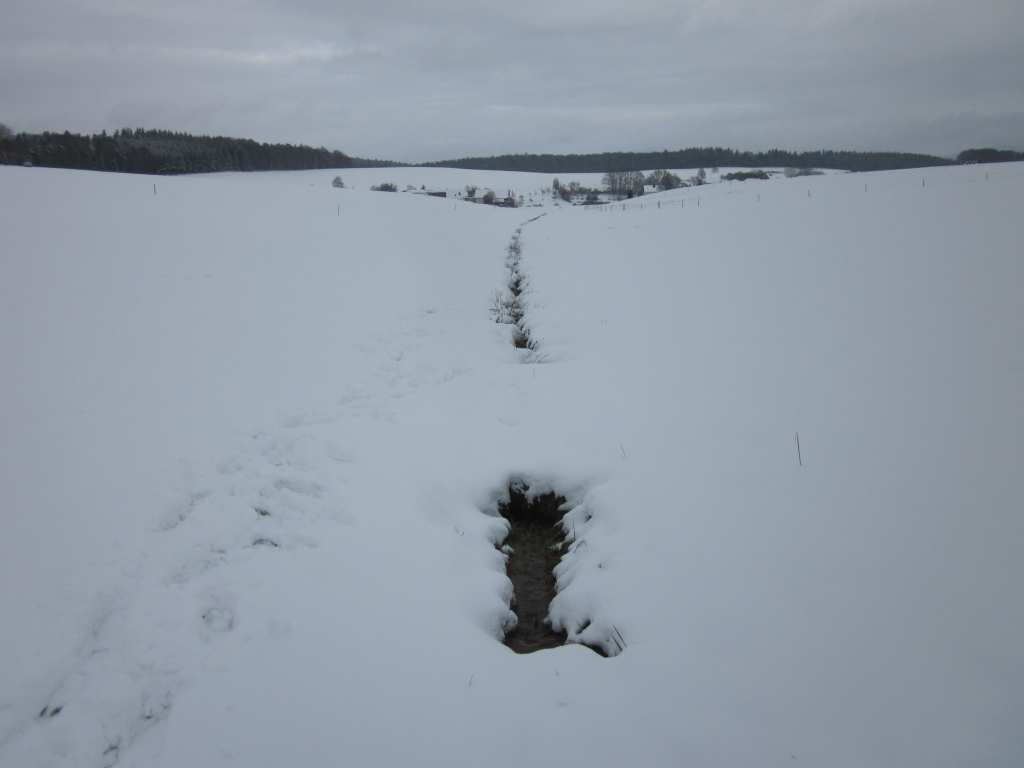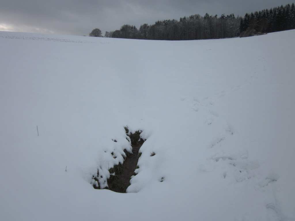 Von dem Quellbereich aus.. | ..Blick Richtung Oberholzhausen. | Blick nach oben zum Talende. | Ein Teil des Wassers kommt wohl aus diesem Draínagerohr | Bei Schnee sieht man den Verlauf des Baches sehr gut. |