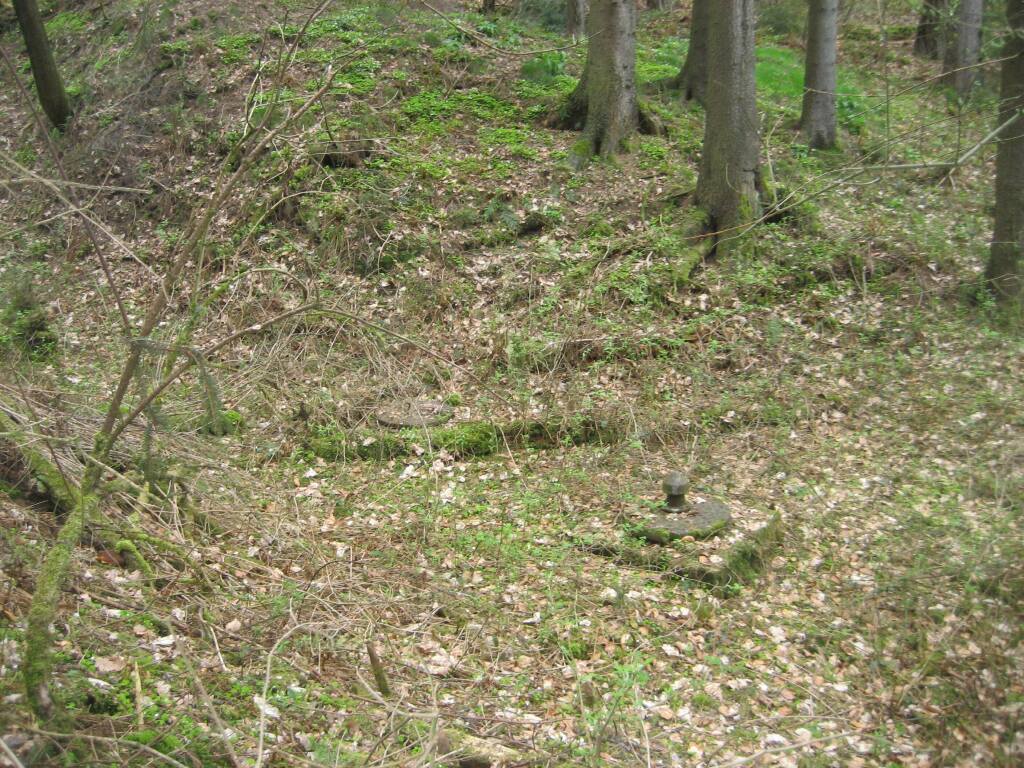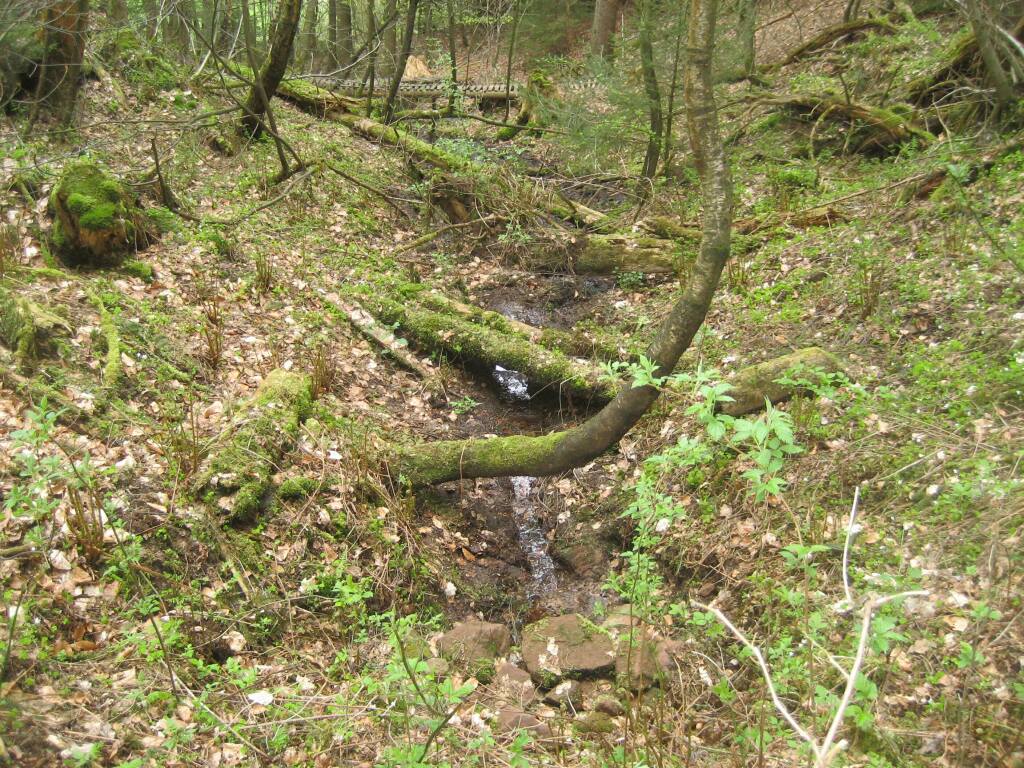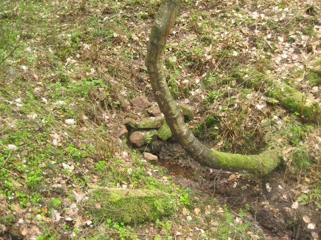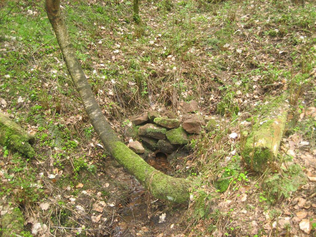 Auf der Kuppe biegt rechts ein Weg Richtung Industriehof ab. Diesen nehmen Sie zu Fuß. Nach 100 Metern erreichen Sie den Waldrand. Weitere 500 Meter weiter, kurz hinter einer ehemaligen Sandgrube auf der linken Seite und noch vor dem Tunnel über die Eisenbahn, sollten Sie links in den Wald gehen. Nach wenigen Metern sieht man einen beginnenden Taleinschnitt. Hier ist nach der Karte der Küppelborn.