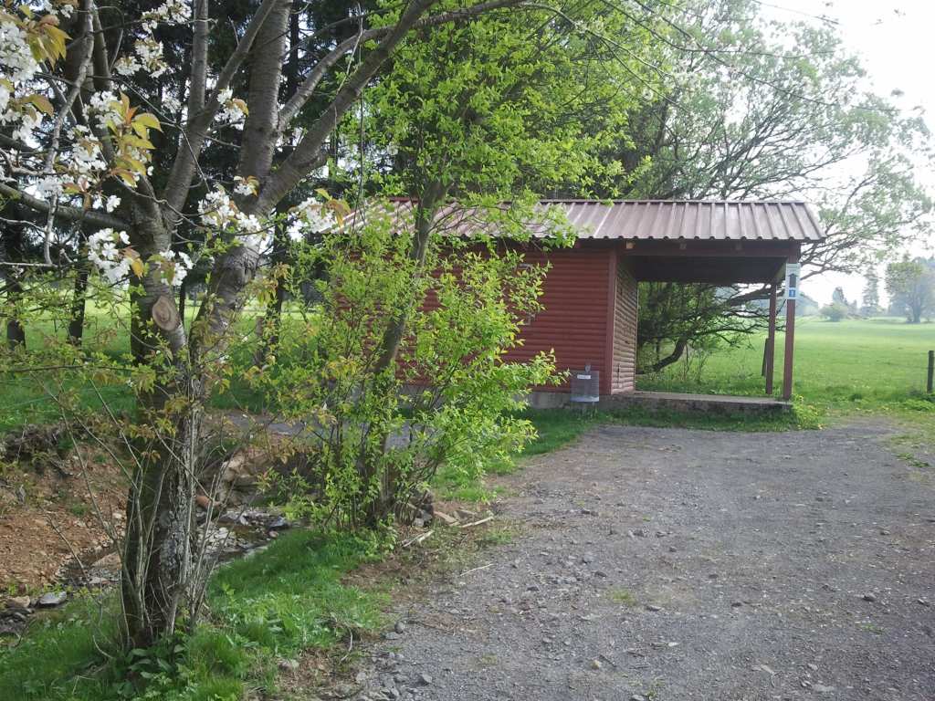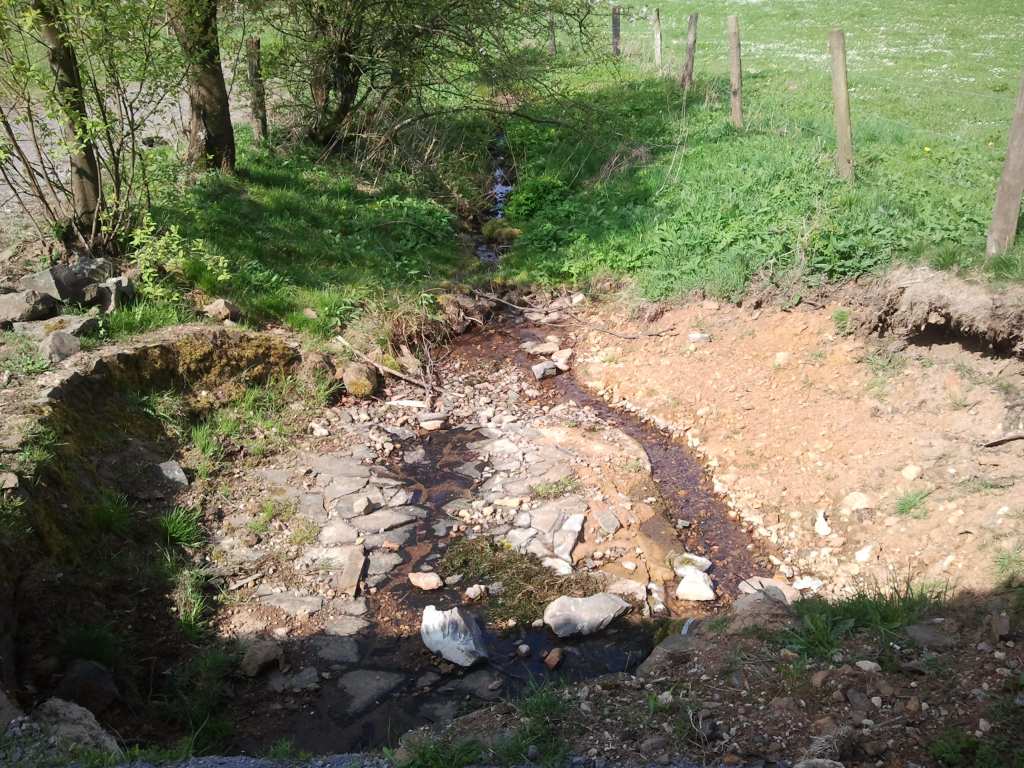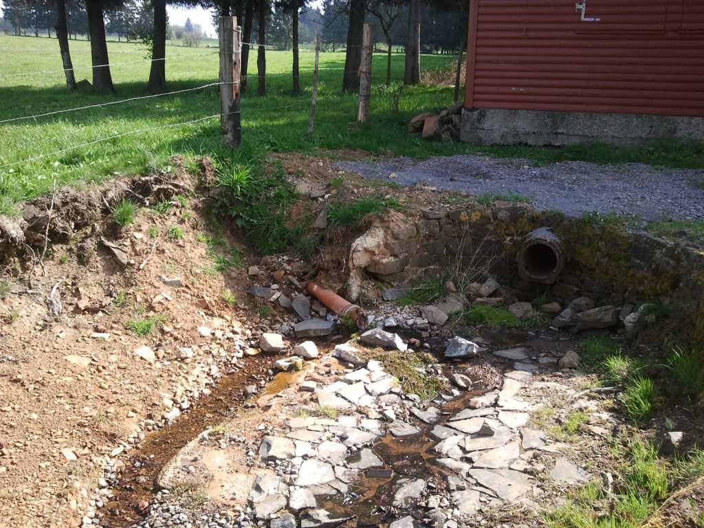 Die Quelle selbst oder das, was man als die Quelle ausweist, macht einen "faden" Eindruck: In dem Bereich vor der Hütte münden zwei Rohre. Das größere Betonrohr dient zur Unterführung der Hütte. Es führte bei meinem Besuch kein Wasser. Das kleinere Rohr ist ein Drainagerohr, das aus dem Wiesengebiet das Wasser abführt. Dies führte Wasser. Ein paar Natursteine in diesen ohnehin von Menschen gestalteten Bereich könnten den Gesamteindruck nachhaltig verbessern...