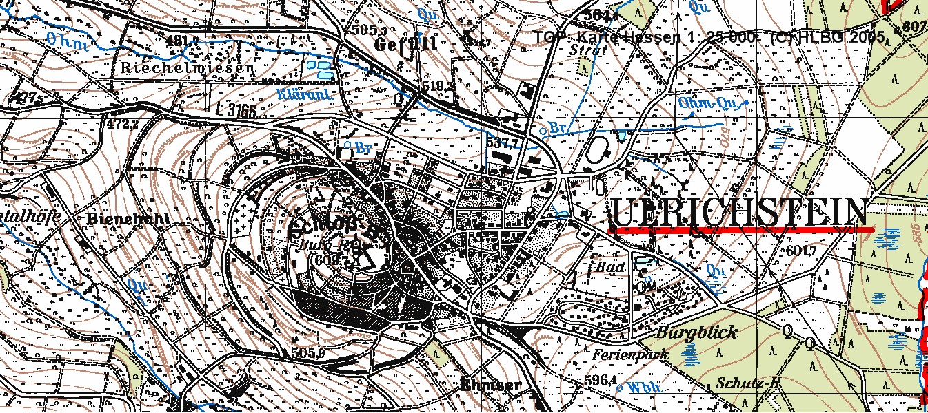 Nordöstlich von Ulrichstein, in der Nähes des Sportplatzes, befindet sich die Quelle der Ohm. Der Fluss ist knapp 60 Km lang und gilt zwischen Kirchhain und der Mündung bei Cölbe in die Lahn als die südwestliche Grenze des Burgwaldes.