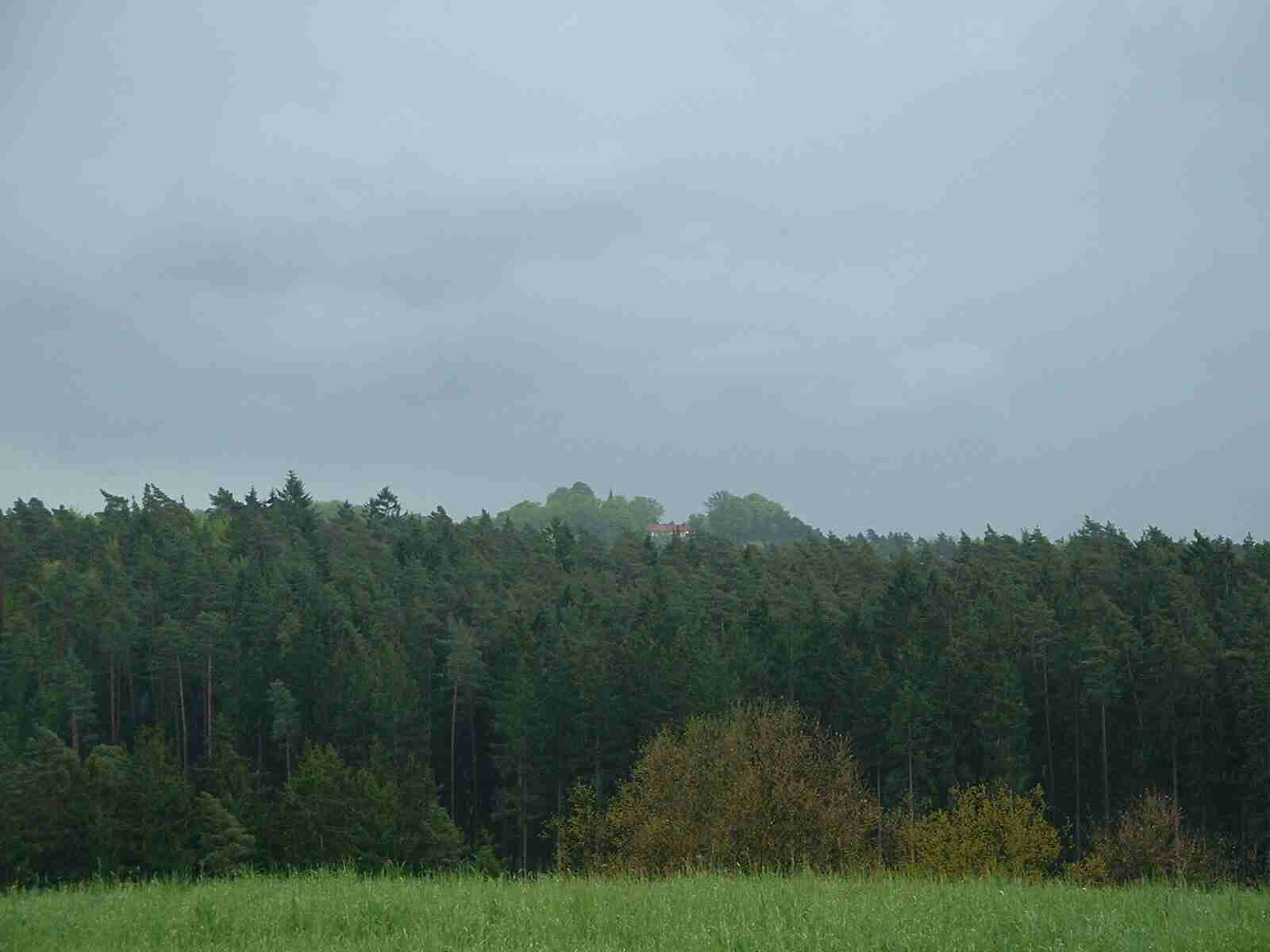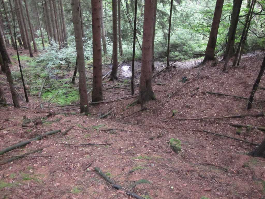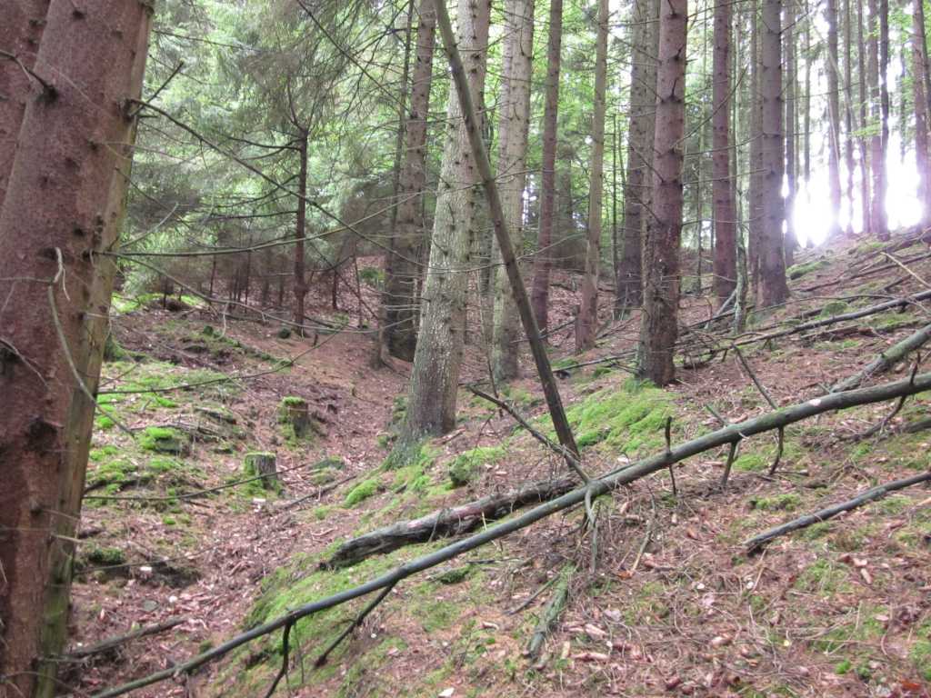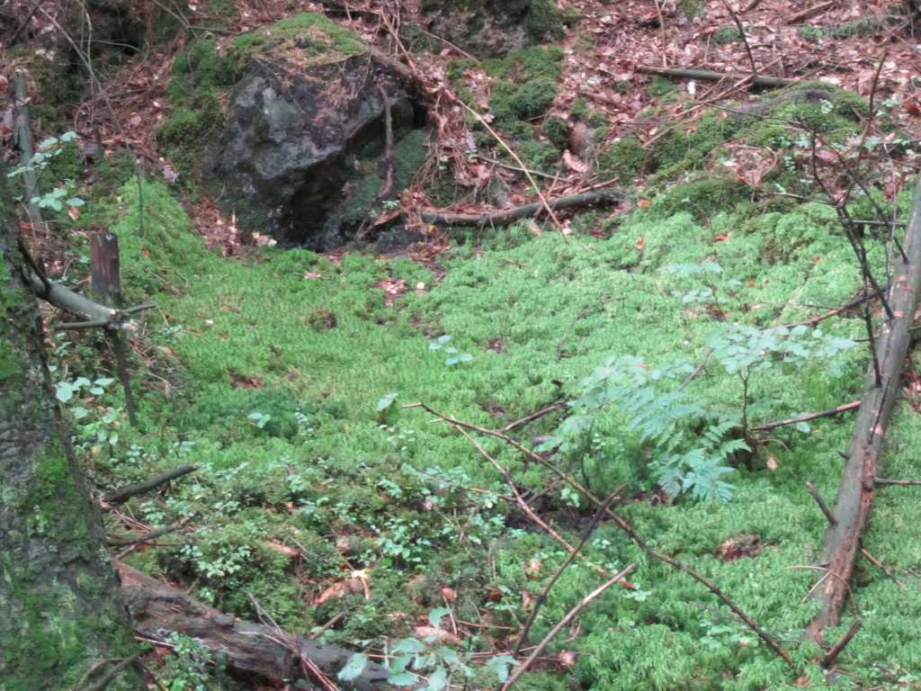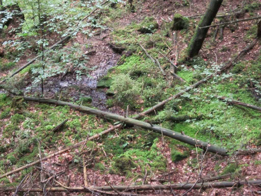 Sie gehen leicht rechts diesen Weg weiter; Sie sehen nach etwa einem Kilometer leicht bergauf auf der anderen Talseite die Ernsthäuser Waldarbeiterhütte. Nach gut 1,5 km biegt der Weg "Am Hain" rechts ab, gehen Sie jedoch leicht links weiter bis auf die Höhe. Von dort, wo der Weg links abbiegend wieder langsam bergab geht, sehen Sie an dem steilen Hang die Quelle von oben.
