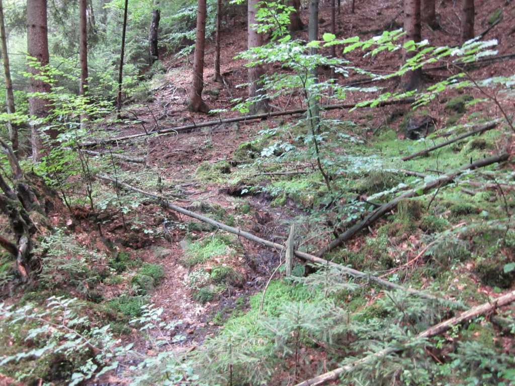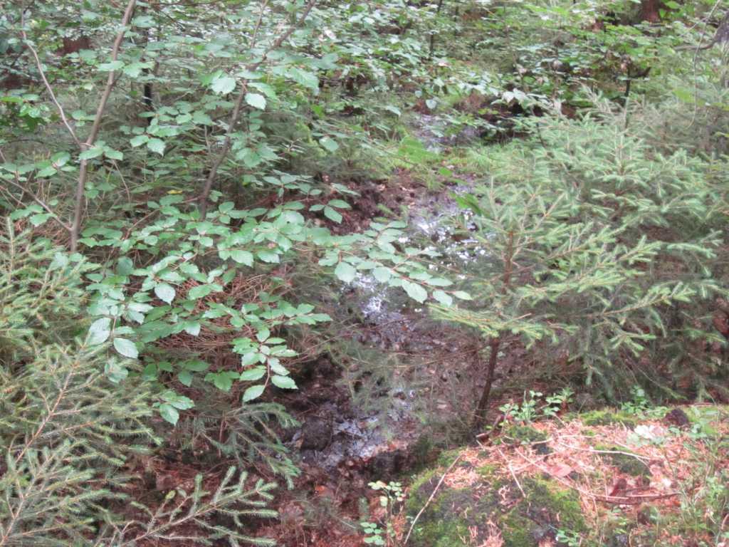 Blick vom Wichtelhausring aus bergab... | ... und von der Quelle bergauf. | Wasser kommt bei diesen Steinen... | ... aus dem Bereich,... |